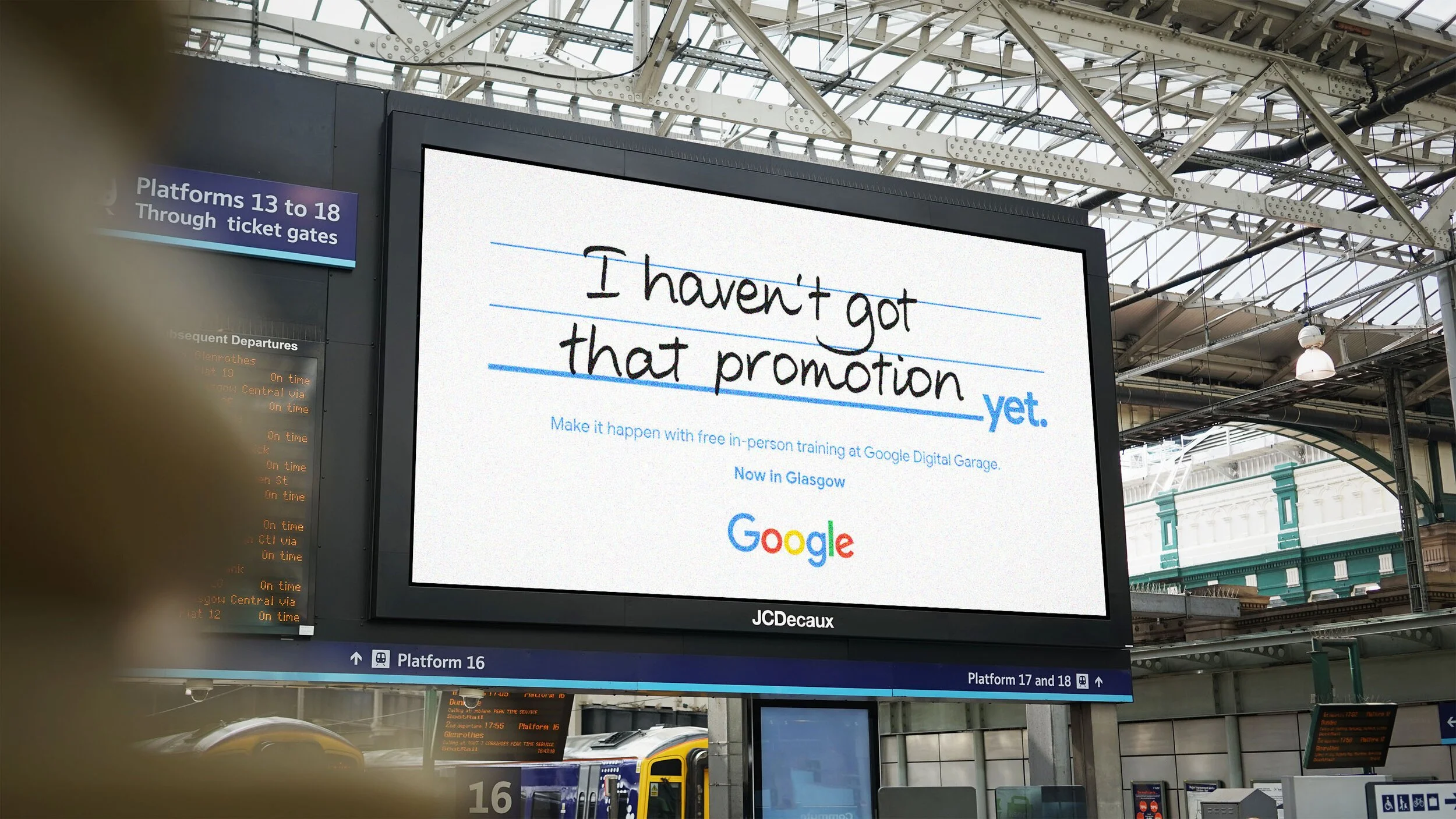 Google Digital Garage is a physical space on the high street offering free digital skills training. At a time when so many feel disenfranchised or stuck as to how to progress their careers, this was a wonderful initiative with the power to transform thousands of lives. To launch the Edinburgh branch, we delivered a rebrand and campaign to inspire people to take that next step in realising their ambition. A combined effort from Google Creative Lab and Forever Beta, I worked as executive producer overseeing all workstreams including interior and experience design of the physical space, live action film, animated film, print, radio, photography, social content and digital advertising.